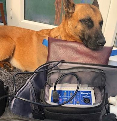 This machine uses an electrical current passed through magnetic coils. The animal doesn't feel a sensation as such, but it does usually have a relaxing effect, particularly on small animals! It can be used for pain management, reduction of swelling, and fracture healing as a few examples.